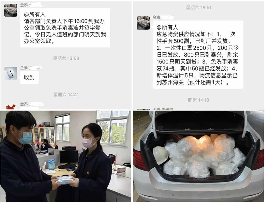 “兵马未动、粮草先行”,充足的防疫物资是打响防疫阻击战的第一步。总经办作为公司后勤保障部门,部门经理周志丹带领部门人员奔波于泰州各大药店和商场,采购防护口罩、防护手套、测温枪、消毒液、喷雾器、抗病毒颗粒等各类防疫物资,做到信息实时共享,物资按需配发。一件件物资组成了厚厚的“工作薄”,一次次奔波刻画了勤劳的“金泰人”。截止2月11日,共采购并配发防护口罩4000只、一次性手套500副、消毒液100公斤、消毒酒精500L。充足的物资供应为公司的疫情防控工作提供了坚实的后勤保障。