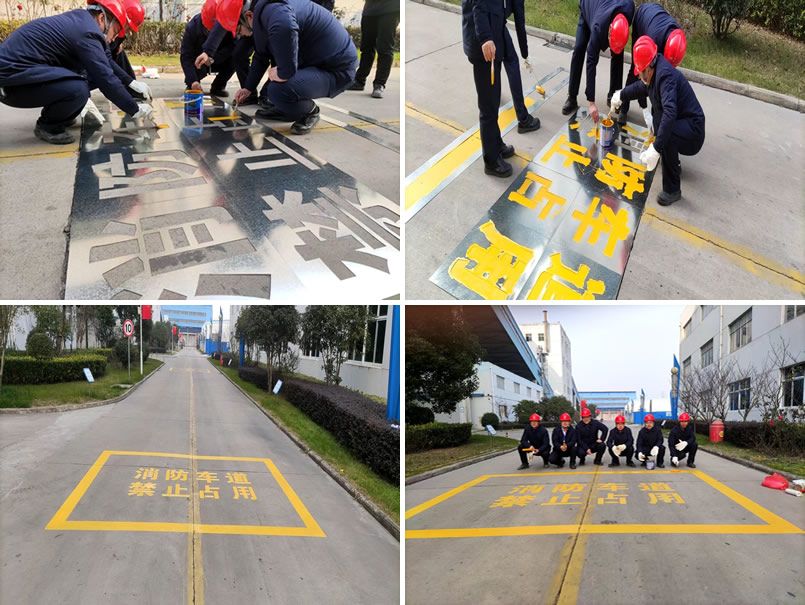 几位党员同志立即查阅规范文件,按照标准制作模具,告知各部门车辆暂停通行,同时拉设道路警示线。在经过几次模具试样后,大家熟能生巧,逐渐掌握诀窍,画出的标识已完全符合规范要求,俨然成为了“粉刷小能手”。随后几位同志分工协作,仅用半天时间便完成了多处消防通道标识完善工作,极大地展示了党员同志们的智慧和一线员工的勤劳。