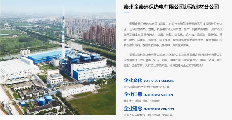 米兰官方网页版位于“水陆要津,咽喉据郡”之称的历史文化名城--江苏泰州,是一家现代化绿色环保、高新技术型民营股份制企业。公司主营供热、发电,致力于发展环保事业,奉献清洁能源。2020年3月成立金泰环保热电有限公司新型建材分公司,分公司是集研发、生产、设计、销售为一体的专业化新型建材企业。